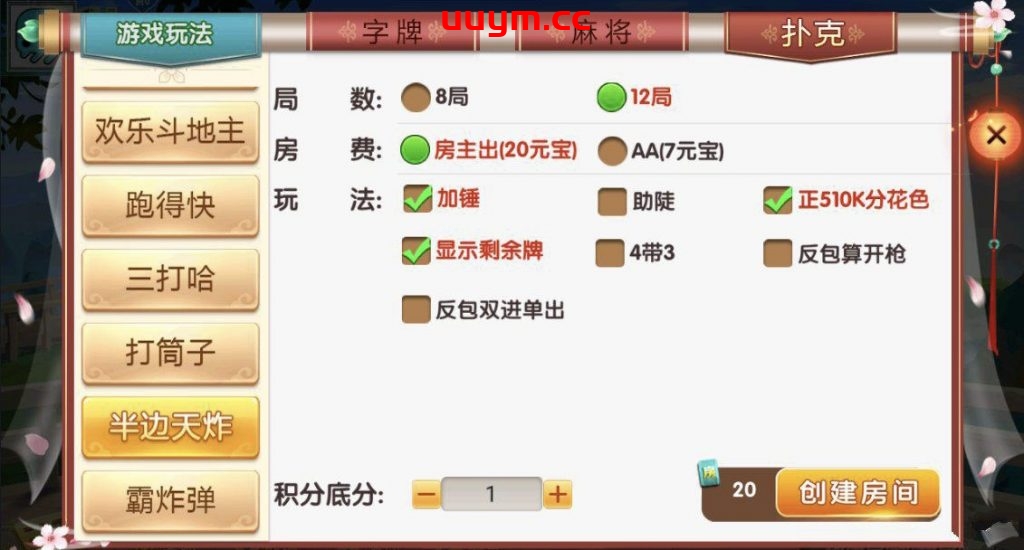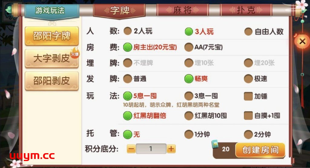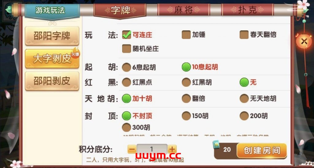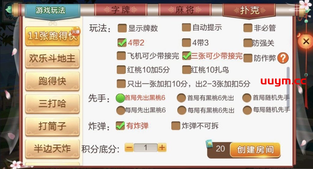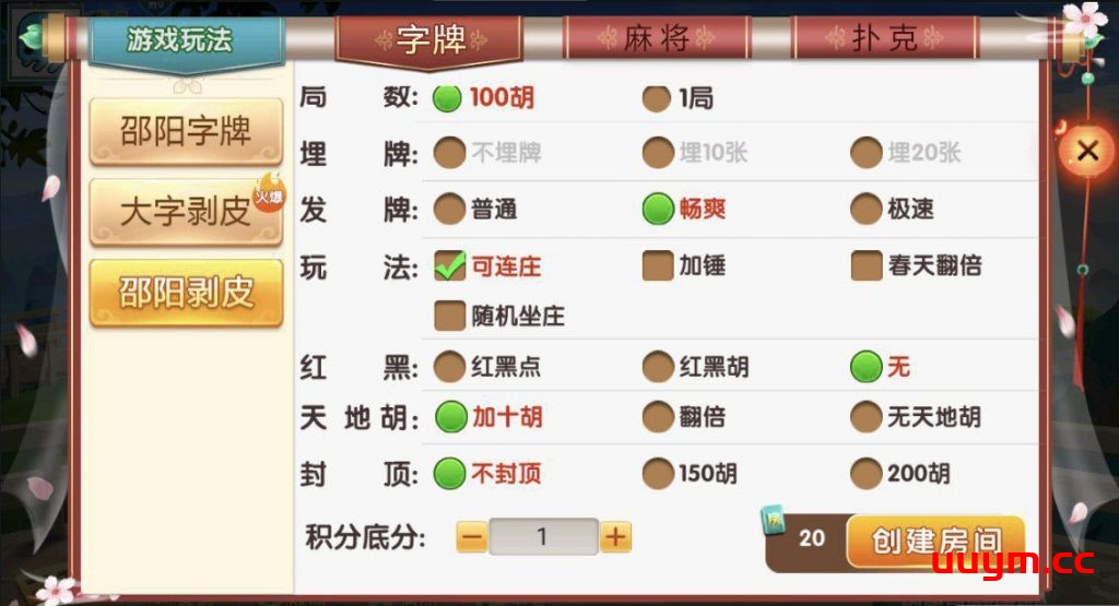 麻将:急速8张麻将,邵阳麻将,长沙麻将,转转麻将,红中麻将,新宁麻将 扑克:11张跑得快,跑得快,斗地主,三打哈,打筒子,霸炸弹,半边天炸 字牌:邵阳字牌,打字剥皮,邵阳剥皮