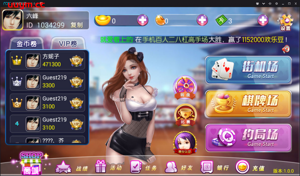 内含游戏:广东麻将,四川麻将,红中麻将,抚州麻将,卡五星,中字麻将,转转麻将,跑得快,牛牛,斗地主,炸金花,德州扑克,百家乐,二八杠,捕鱼