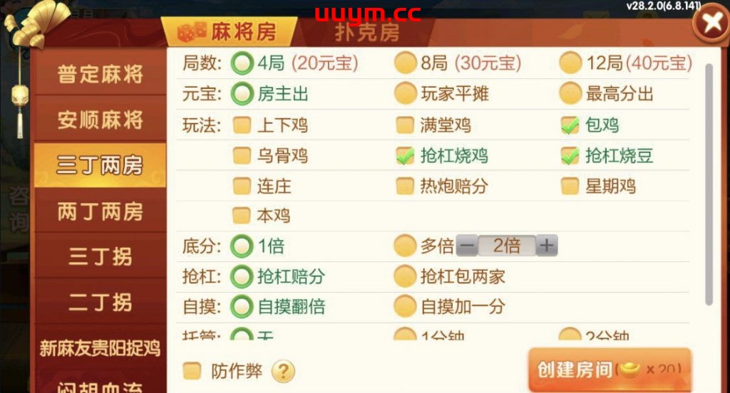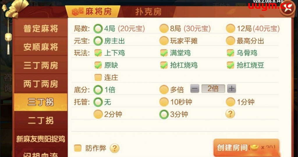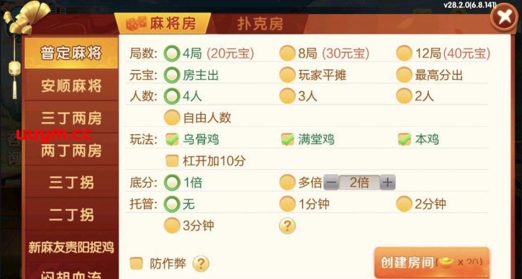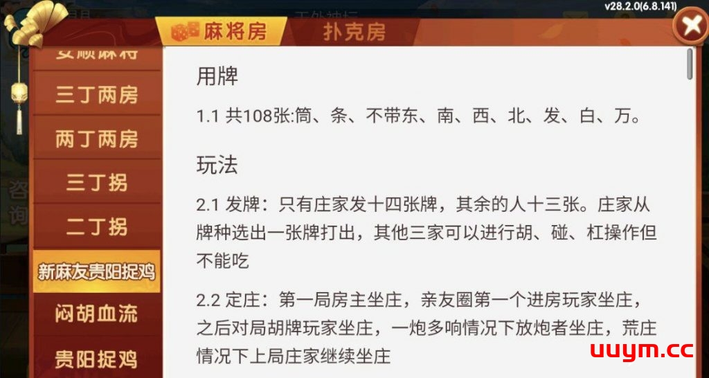 麻将:普定麻将,安顺麻将,三丁两房,两丁两房,三丁拐,两丁拐,新麻友贵阳捉鸡,闷胡血流,贵阳捉鸡